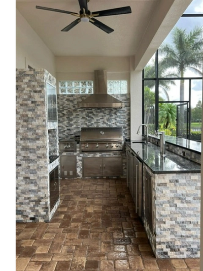 Choose your layout, tiles, stones, countertops, and equipment configurations. Custom grills, hoods, sinks, faucets, refrigerators, coffee bar, keg, ice makers, storage cabinets, etc..